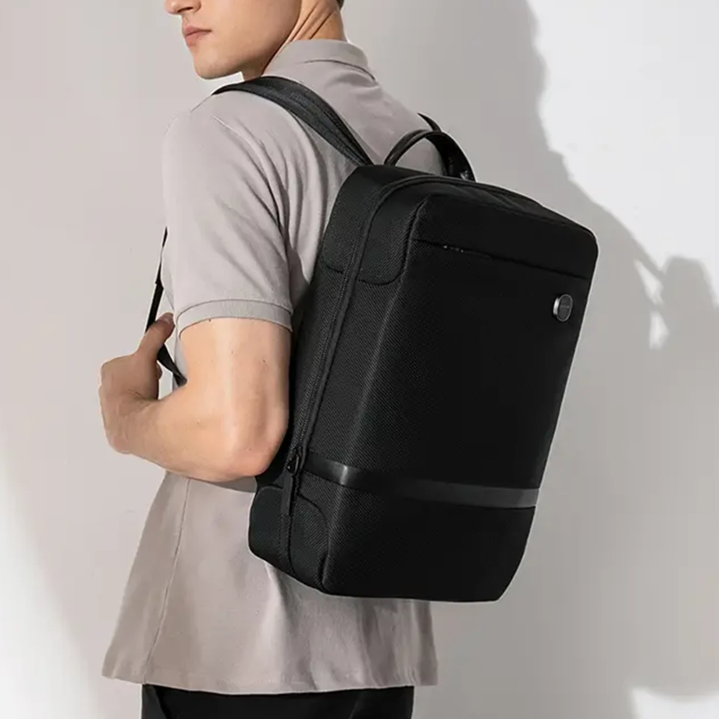 תיק גב אלגנטי ומינימליסטי לעסקים, עשוי מבד עמיד למים עם תאי אחסון פונקציונליים, רצועה לטרולי ותא למחשב נייד עד 15.6 אינץ'. מתאים לנסיעות, עבודה ושימוש יומיומי.