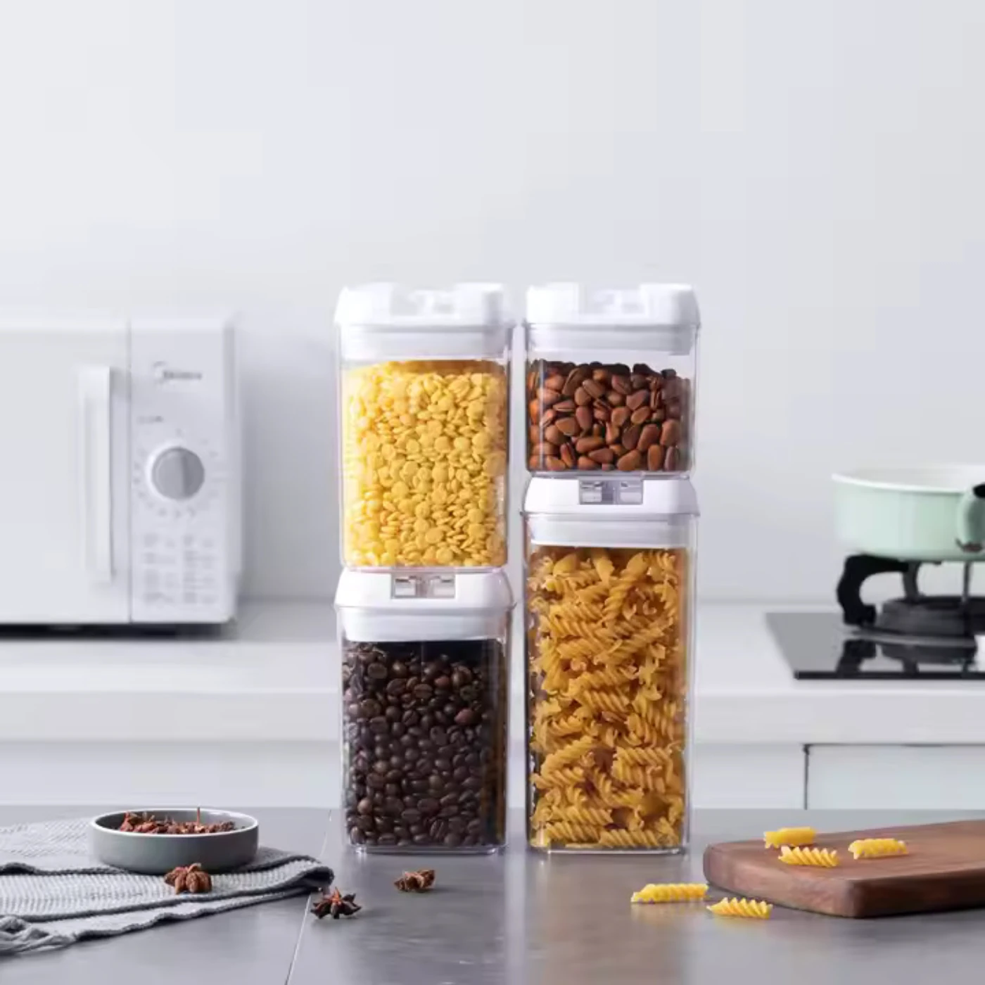 מארז 7 קופסאות אחסון מעוצבות, בעלות מכסים אטומים לשמירה על הטריות והגנה מפני לחות, חמצן ומזהמים. עשויות פלסטיק איכותי ללא BPA, בטוחות לשימוש עם מזון. הסט כולל מגוון גדלים (500 מ"ל עד 1900 מ"ל) לאחסון אופטימלי של מוצרים יבשים, דגנים, חטיפים, קטניות ועוד.