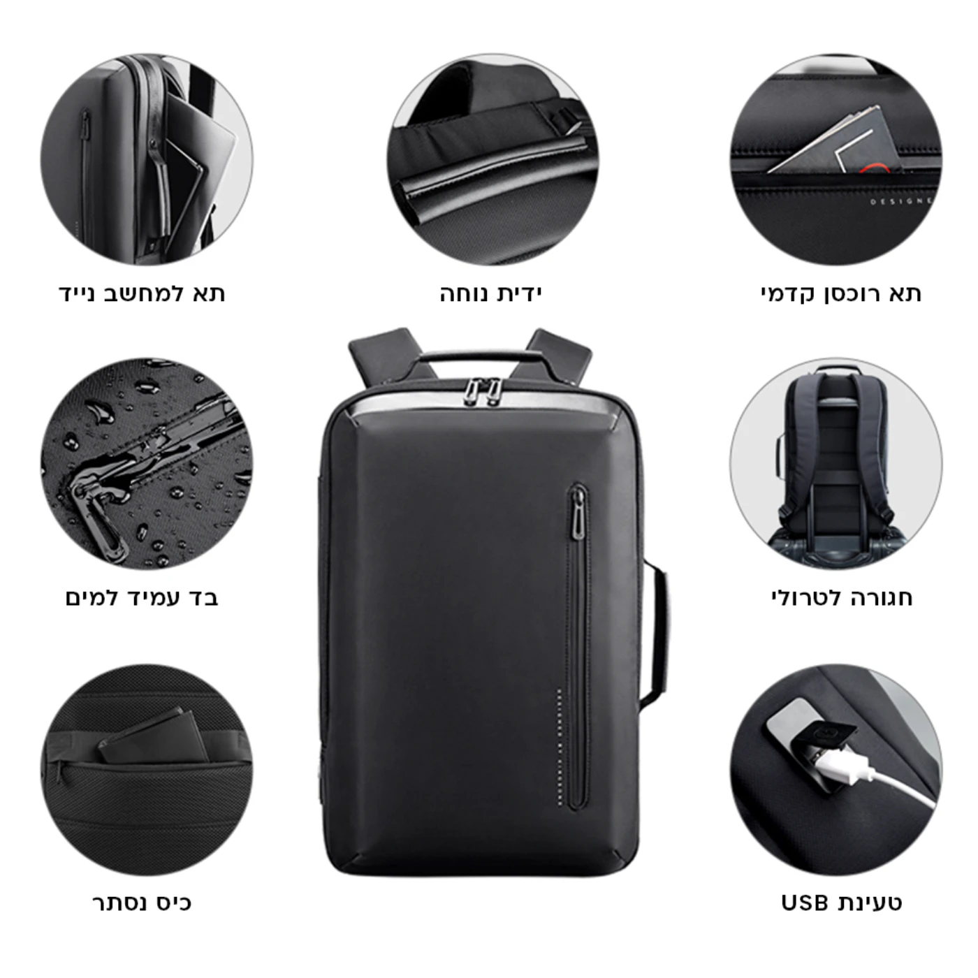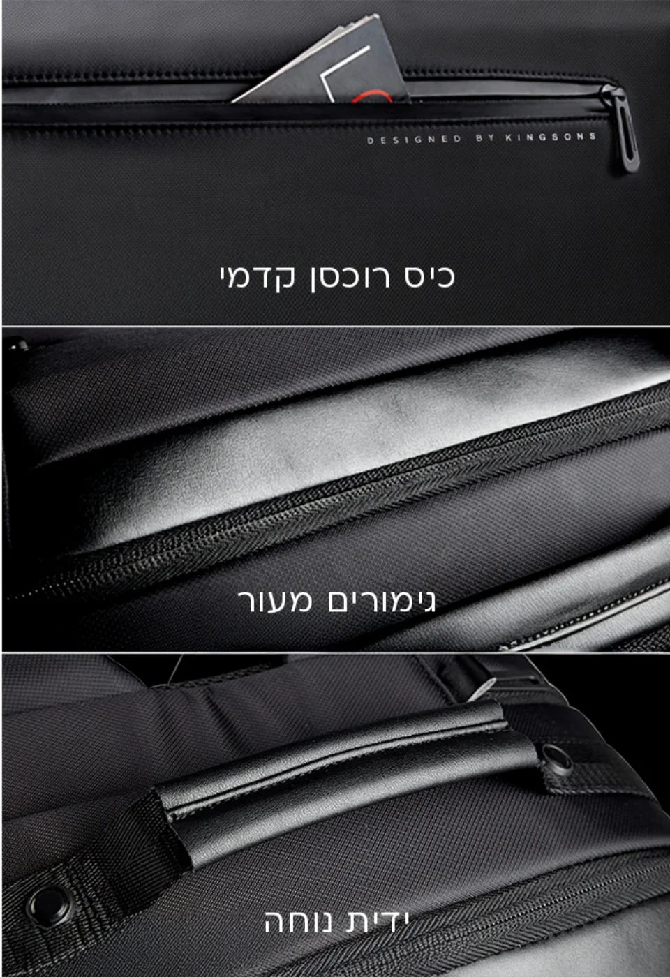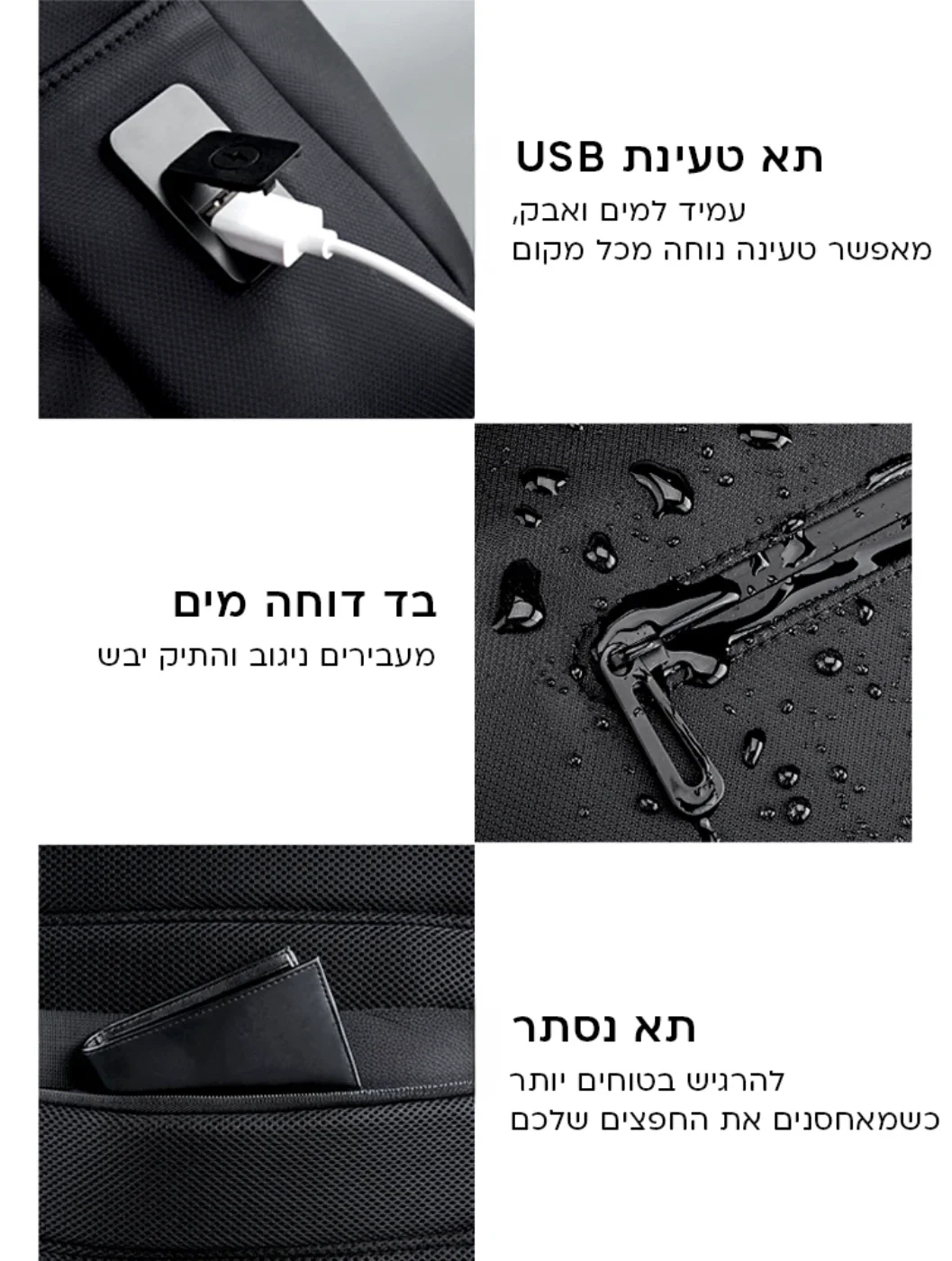 התיק המושלם למי שמחפש שילוב של פונקציונליות, נוחות ועיצוב מרשים. עם תא ייעודי לטעינת USB, כיסים נסתרים, חלוקה פנימית מסודרת ובד דוחה מים. בקיצור, הבחירה המובילה ליום עבודה עמוס או נסיעות. הפתרון האידיאלי לשגרה שלך בעזרת הנוחות והסדר הייחודיים שלו.
