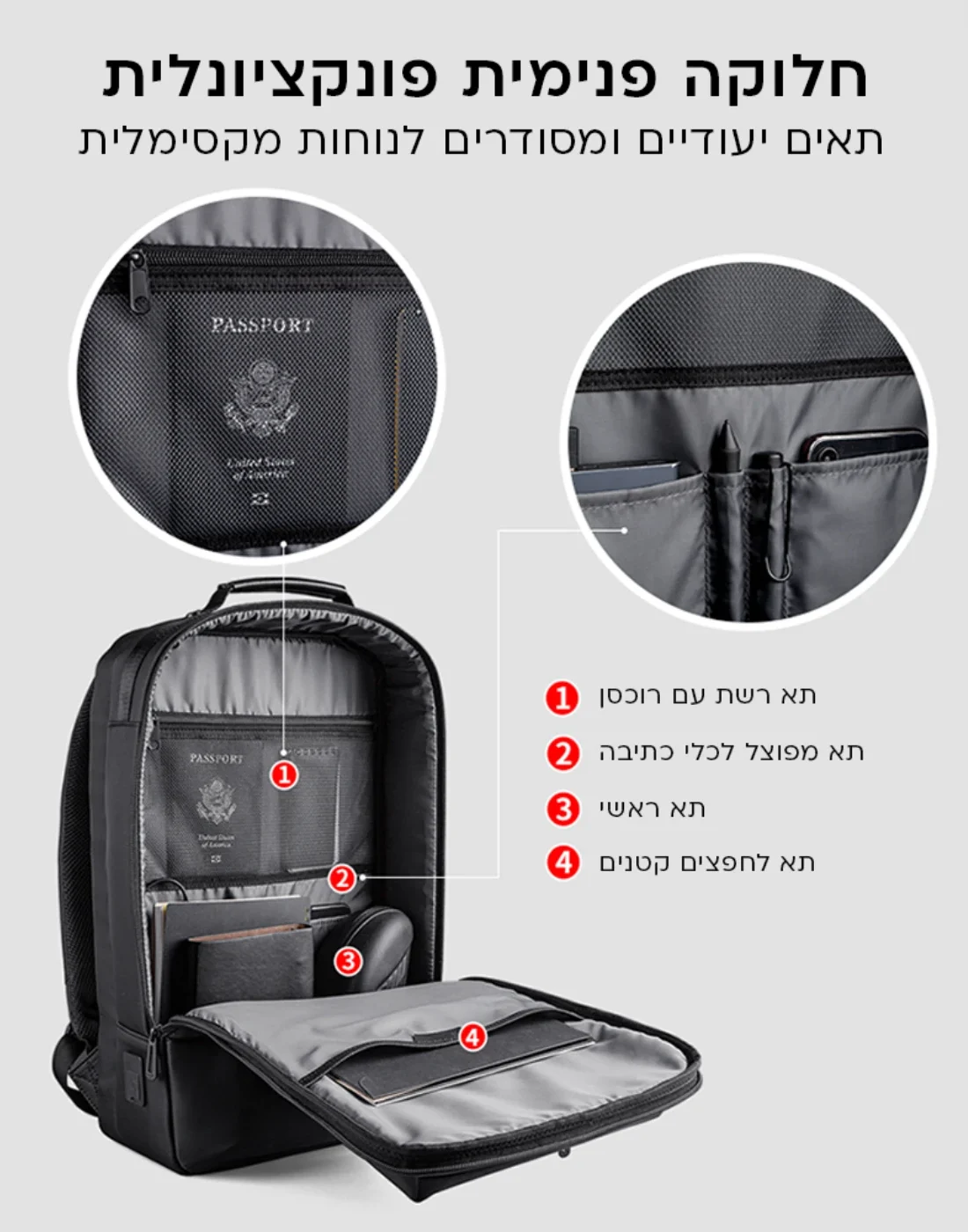 אחסון מתקדם: חלוקה פנימית חכמה וכיסים נסתרים לשמירה על חפציך האישיים בבטחה.